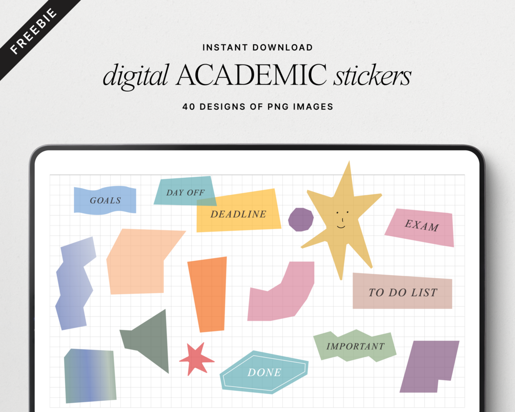 Bring creativity and organization to your academic planning with our exclusive set of 40 Digital Academic Stickers! Each sticker features a unique, abstract, and beautiful design in vibrant colors to add personality to every page. You’ll find helpful labels to help you keep track of tasks, timelines, and goals.
